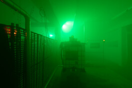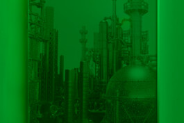 滞在時間が長くなるにつれ、工業施設であるという印象は徐々に揺らぎ始める。それはコラージュとして姿を現す。現実の工業施設を完全には再現しきれない、想像上の環境である。その不整合のなかで、インスタレーションは断片の集積として立ち上がる。そこに構築されるのは、20世紀の一部としての「工業」をめぐるノスタルジックな像である。テクノ・フューチャリズムと終末的想像のあいだを漂う束の間のイメージ群から引き出された構成は、奇妙な磁力を帯びると同時に、誇張された工業的コードの交錯のなかで何が欠落しているのかを示唆する。